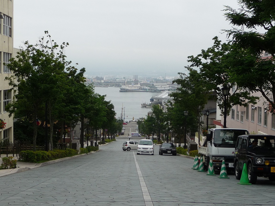 Lorsqu'on visite la ville de Hakodate, on est d'abord intrigué par le site, très original. En effet, la ville se situe essentiellement sur une étroite bande de terre (parfois classée parmi les tombolos, parfois parmi les péninsules), qui se termine par une zone montagneuse, où culmine le mont Hakodate (334 mètres... bon, c'est une colline). Il y a toutefois un téléphérique permettant d'accéder au sommet pour admirer la vue. Sans monter jusqu'en haut, les différentes rues en pente dans la ville donnent un aperçu:
